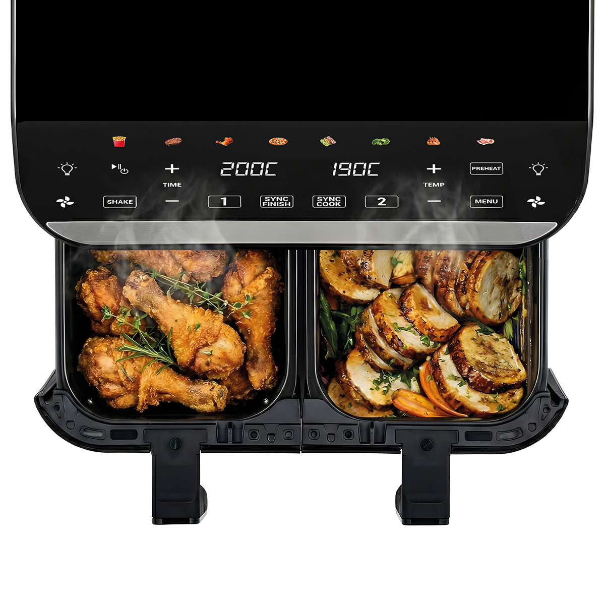 Funkce Sync Cook umožní vám ušetřit čas tím, že nastavíte současně stejnou Teplotu a Délku ohřevu pro oba dva koše současně. Funkce Sync Finish umožní nastavit různé programy na stejný čas ukončení. Potraviny v obou koších pak budou dokončeny ve stejný čas bez zbytečného čekání, to znamená, že nebudete například muset čekat s hranolky, až bude maso hotové (a naopak).