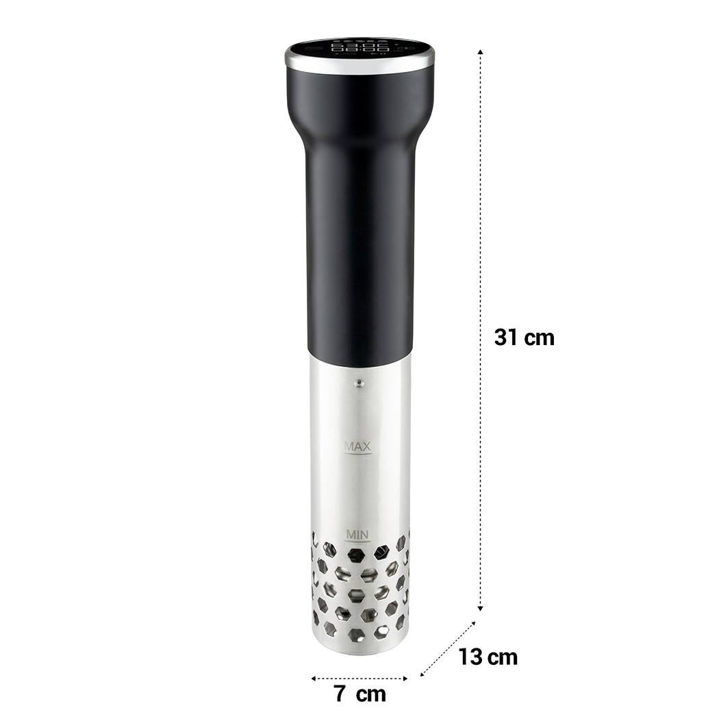 Tento sous vide vařič lze použít ve všech žáruvzdorných nádobách s výškou alespoň 16 centimetrů a objemem až 20 litrů, což z něj činí perfektní volbu pro všechny amatérské kuchaře. Jednoduše nastavte teplotu a čas na snadno čitelném LED displeji a můžete začít. Díky praktickému šroubovacímu uzávěru je spotřebič bezpečně připevněn k okraji hrnce a během provozu neklouže. Po dokončení vaření je možné využít ochranný obal a umístit jej do šuplíku, kde je připraven pro příští použití.